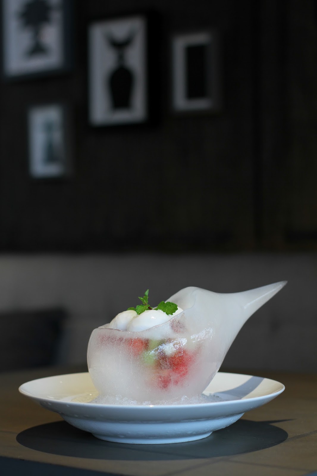 - 0° Celcius. Seven types of fresh exotic fruits, tangy lime sorbet and exquisite champagne bubbles inside a frozen water drop ice bowl. A fresh cleanse for the palate and a delicious way to end a meal.