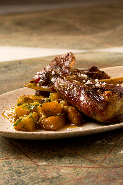 In addition to the gourmet tinned seafood and fine hams imported from Spain, dishes served in the restaurant include Tapas, such as Anchoa (Cantabrian anchovy, crouton, smoked tomato sorbet) and Tartar (Wagyu tartar, whipped roe, sesame crisp); Raciones, such as Bacalao (saffron-battered cod, mojo verde, piquillo pepper), Cecina (air dried beef, truffle foam, poached organic egg) and Arroz (seafood and saffron bisque wet rice); as well as dishes from the Josper oven, including Pescado (whole baked halibut with a burnt butter sauce, hazelnuts and capers), Cordero (Central Javanese suckling lamb shoulder with saffron potatoes) and Bistec (Wagyu flank steak, white anchovies and horseradish).
