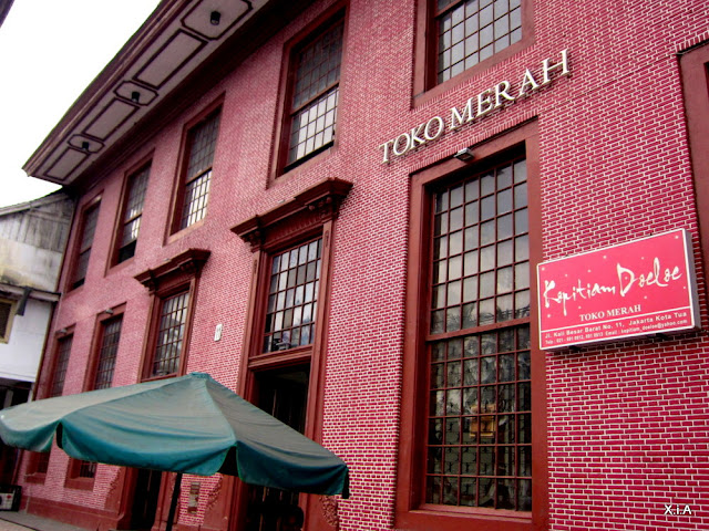 Dinamakan demikian lantaran warna bangunan yang didominasi warna merah. Sebenarnya, Toko Merah sendiri merupakan bangunan “kembar”, dengan tipikal dua rumah yang tergabung dalam satu atap. Merupakan bangunan berarsitektur klasik Eropa dan Tiongkok, lokasi Toko Merah sendiri ada dekat dengan pusat pemerintahan, yakni di tepi Kali Besar (de Groote Rivier). Pada pertengahan abad ke-19, gedung ini berfungsi sebagai sebuah toko, dengan nama pemilik Oey Liauw Kong. Seiring berjalannya waktu, Toko Merah pernah difungsikan sbeagai kantor hingga Gedung Dinas Kesehatan Tentara Jepang.