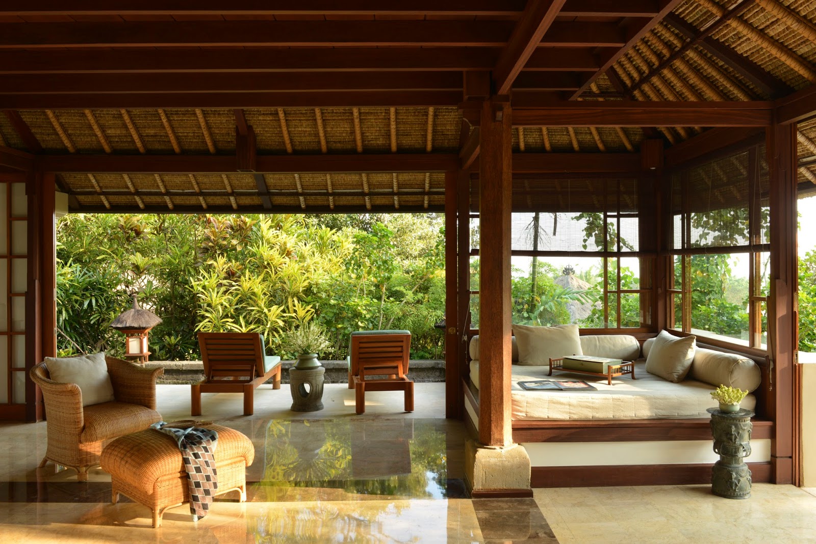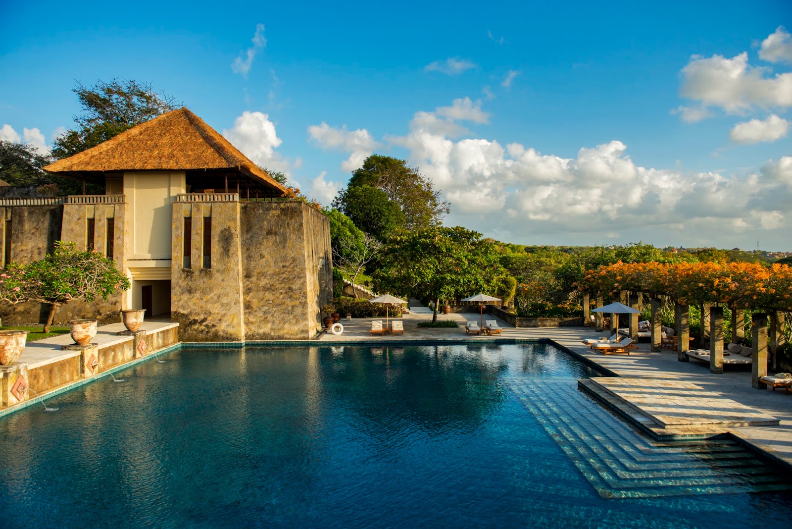 high above the winding Ayung River Gorge and follows the design of a traditional Balinese village with pebbled walkways linking the 30 thatched-roof suites and villa to the restaurant, bar, swimming pool, library, gym and Aman Spa. Amandari provides a unique setting from which to experience the cultural richness of Bali’s artistic centre, as well as its mountainous region to the north.