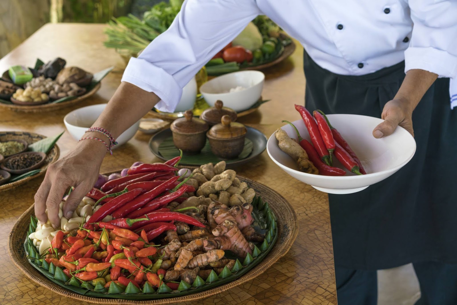 Back at Amankila fresh herbs are collected from its vegetable garden, while a communal table is prepared with all necessities including bumbu – a local spice paste. Available for children too, the classes are collaborative, with chefs teaching new skills and the history behind each recipe, before everyone tucks into the finished product for lunch.