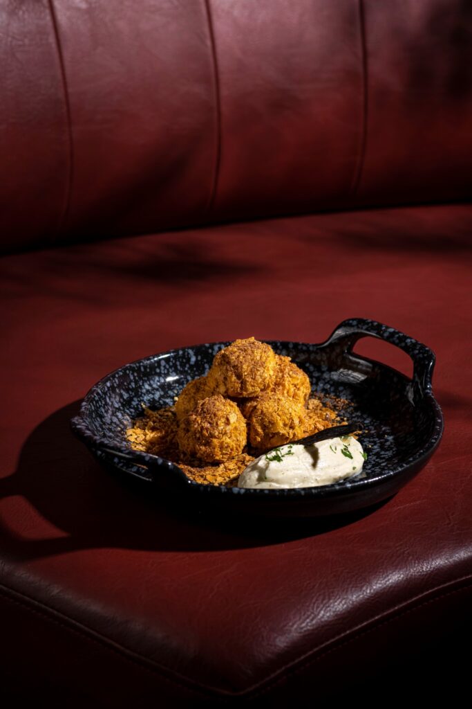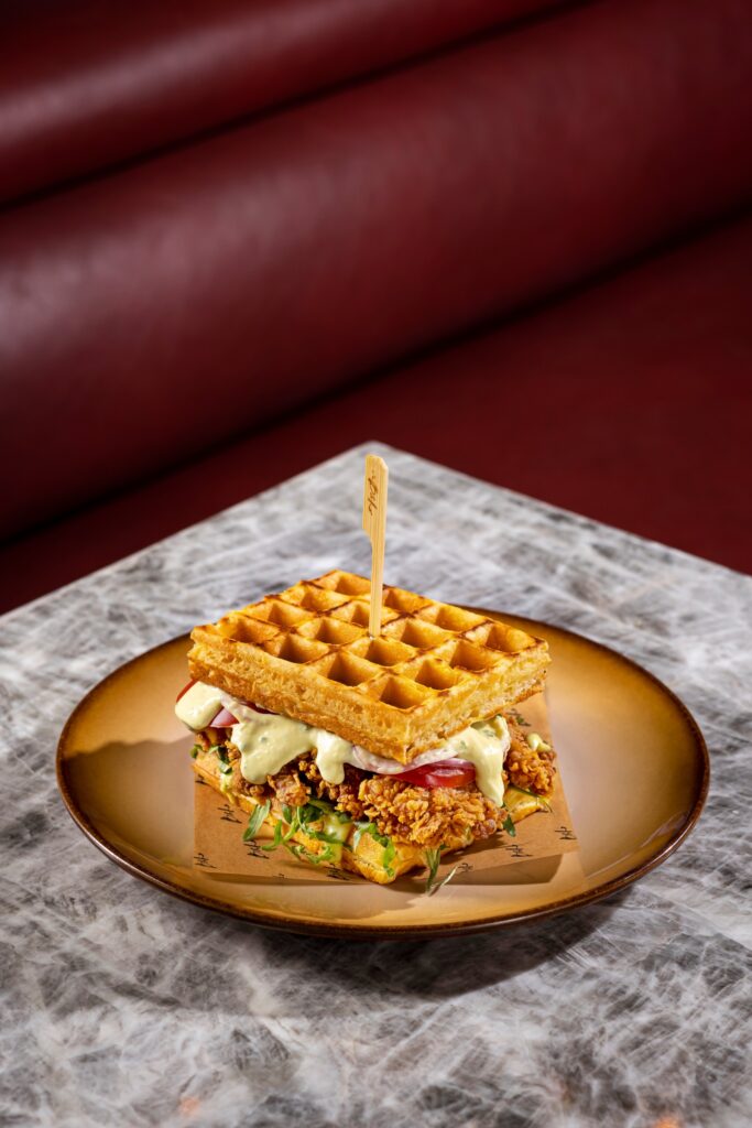 Hidangan yang playful namun tetap refined. Paha ayam goreng renyah disajikan di atas waffle hangat, dilengkapi garlic aioli, arugula, beef tomato, dan red onion rings. Perpaduan gurih, manis, dan tekstur renyah menciptakan pengalaman makan yang memuaskan.